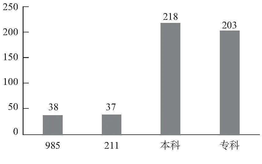 我国高校划分为不同的类型等级,有较高水平的“985”“211”大学,亦有非重点本科高校和专科院校。不同类型的高校是否会影响涉案金额(见表2)和案件数量(见图6)?通过表2可以发现,“985”和本科高校在涉案金额均值上明显高出“211”和专科高校。“985”高校在涉案金额中位数上明显比其他类型的高校要高,这应该和东北某“985”高校的涉案金额非常高有关。