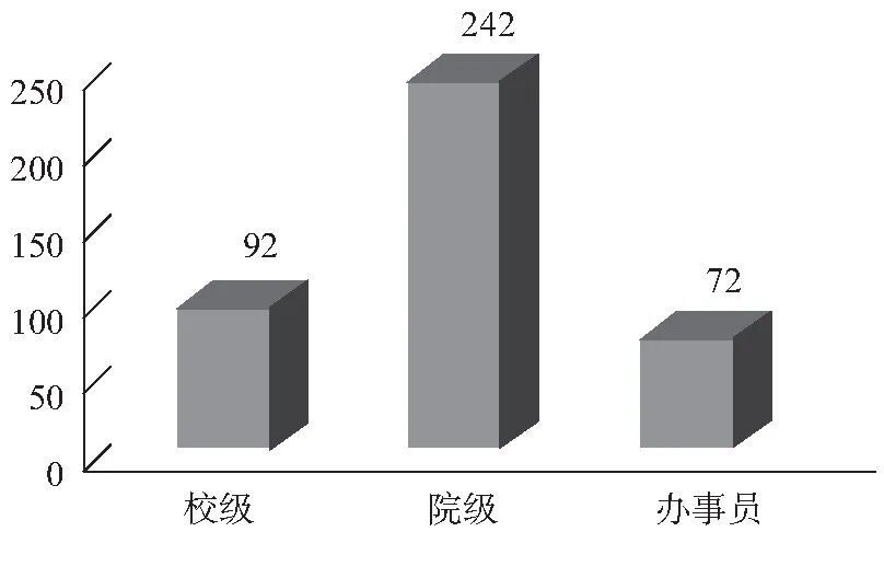 涉案人员的职务级别和案件数量之间是否存在某种相关?是否某个职务级别会成为腐败案的集中地(见图5)?通过图5可以发现,院级领导最高,达242个案件;校级领导和办事员的贪腐案件则相对较少,分别有92个和72个。这种情况可能与高校腐败案多发的领域有关。综合上文中的一些结论,高校腐败案件最多的领域是财务、基建、采购和招生。相比于校级领导,院级领导对学院的具体工作给予了更多的关注,在具体决策上也有更大的发言权,因此在腐败交易中有更大的市场,涉案数量更多。结合图4中的涉案金额,可以发现院级领导同时具有涉案金额均值高和涉案数量多两个特征,应该予以关注。这可能的原因是:一方面,高校正在进行简政放权,大部分工作和权力下放到学院这一层级,而相应的监督配套措施没有及时跟上;另一方面,院(处)级领导经常接触和具体管理着高校的财务、基建、采购和招生等腐败频发的业务领域。