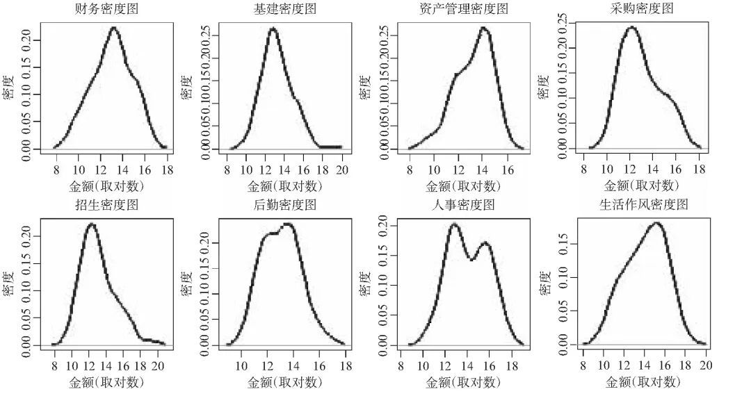 在统计分析中,用某一数值来说明总体情况难免产生偏颇。为保证分析的准确性,必须从多个角度进行交叉验证。因此,本文首先对案例样本中的财务、基建、资产管理、采购、招生、后勤、人事和生活作风等8个腐败的领域做了基本的描述性统计(见表1),然后再分析这些领域涉案金额的核密度分布状态,最后才能确定均值和中位数对样本的描述是否准确。