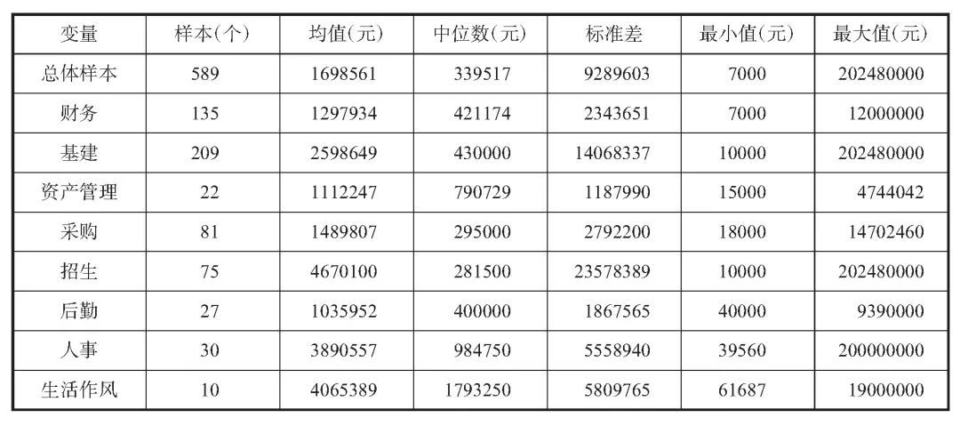 从全部样本的统计量来看,最小的涉案金额是7000元,最大的涉案金额是202480000元,出现在基建和招生两个领域中。从案件数量来看,案件集中发生在基建领域,有209个案件样本,财务方面的案件也较多,最少的是生活作风方面的案件,有10个案件样本。从所有样本的平均状况来看,腐败金额的均值是1698561元,中位数是339517元,可以发现均值明显被一些金额较高的案例拉高了。通过对案件数量、整体均值、整体中位数、最大值和最小值的分析,可以对高校腐败的整体情况有一定的把握。