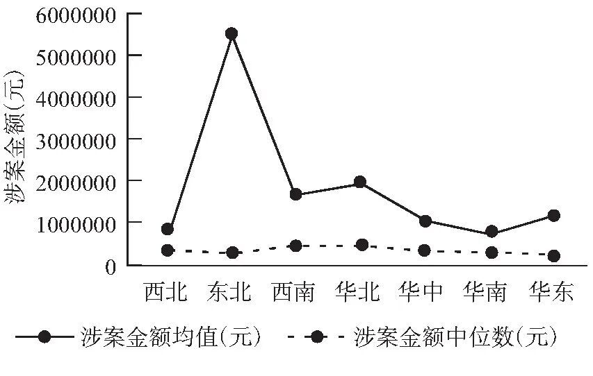 为了能够更加清晰地认识不同行政区的高校贪腐案在涉案金额上的差异,将各个省级行政单位归类到西北、东北、西南、华北、华中、华南和华东几个大的行政区,再分别计算这些行政区内高校涉案金额的均值和中位数(见图3),可以更加直观地从折线的变化幅度中看出不同地区涉案金额均值和涉案金额中位数的变化幅度。如图所示,在所有的行政区内,涉案金额的均值都大于涉案金额的中位数,且东北地区的涉案金额均值尤其突出,华北、西南和华东地区的涉案金额均值也较高。但各个地区的涉案金额中位数在折线图中变化幅度不大。